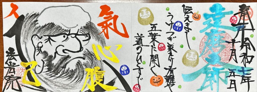 10月5日は達磨大師の命日です。今日では『だるまさん』などと呼ばれ、縁起物の手足のない姿の像がイメージされたり、『だるまさんが転んだ』という遊びなどで老若男女問わず、慕われています。そんな達磨大師はインドからお釈迦様の禅の教えを中国に伝えにやってこられた僧侶なのです。中国での達磨大師の行実は数多く伝えられいます。今回の御朱印テーマになっている『廓然無聖』という言葉も当時の中国の皇帝、武帝との禅問答に出た言葉です。達磨大師から五代の祖師方を経て、禅宗の教えは「五葉」五つの門葉に分かれ、そのひとつが私たち曹洞宗となったのです。今月は禅宗の初祖とされる達磨大師にお慕い、ご供養させて頂きます。